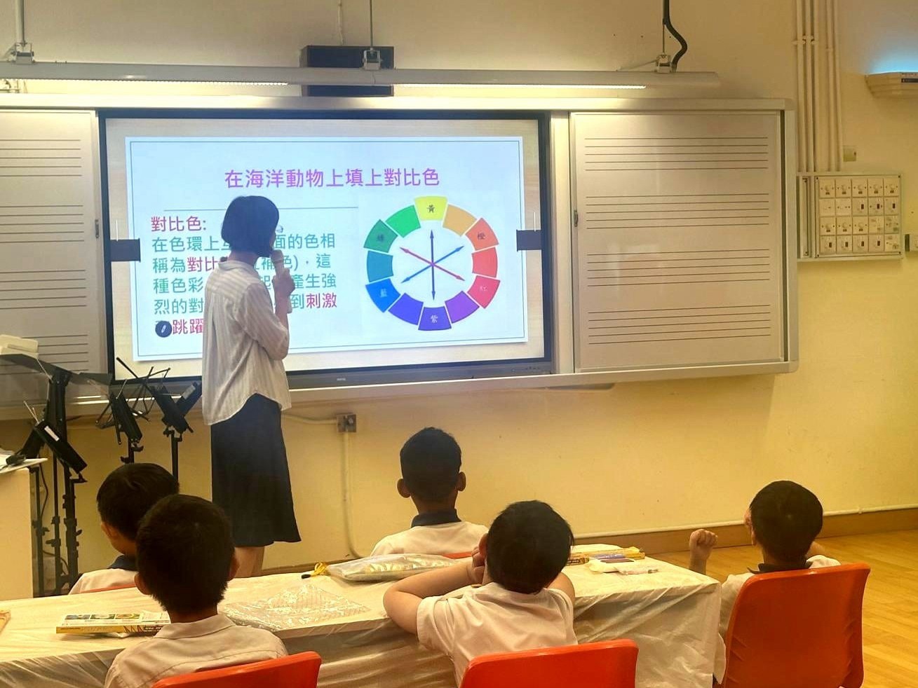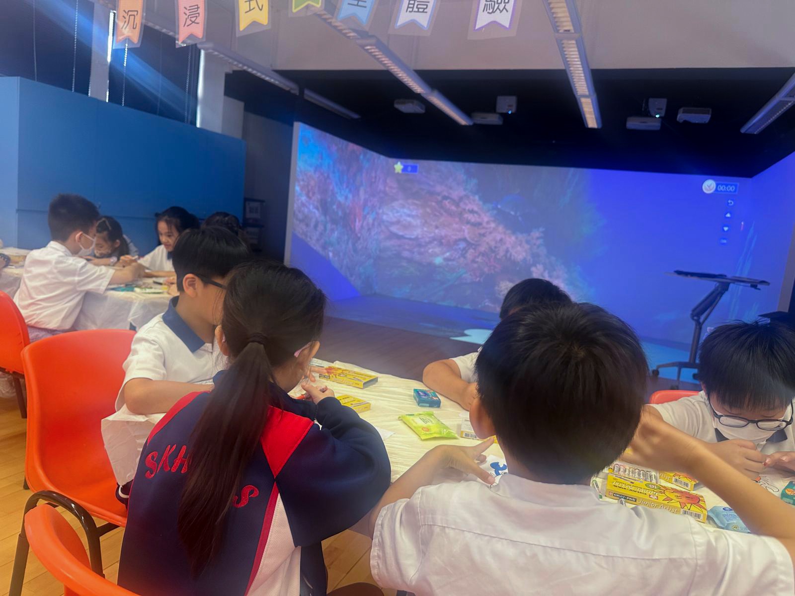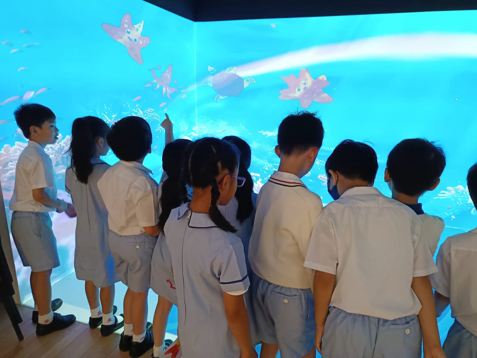 二年級同學透過創新科技沉浸系統來探索海洋世界, 認識有脊椎和無脊椎動物,提升對生物分類的認識。藉着課堂,學習對稱圖案的畫法和對比色填色技巧,並發揮藝術創意。在結合科技、藝術與互動元素的沉浸室內同學們與自己的作品產生互動的元素,有效加深對海洋生物的理解,強化學習成果。