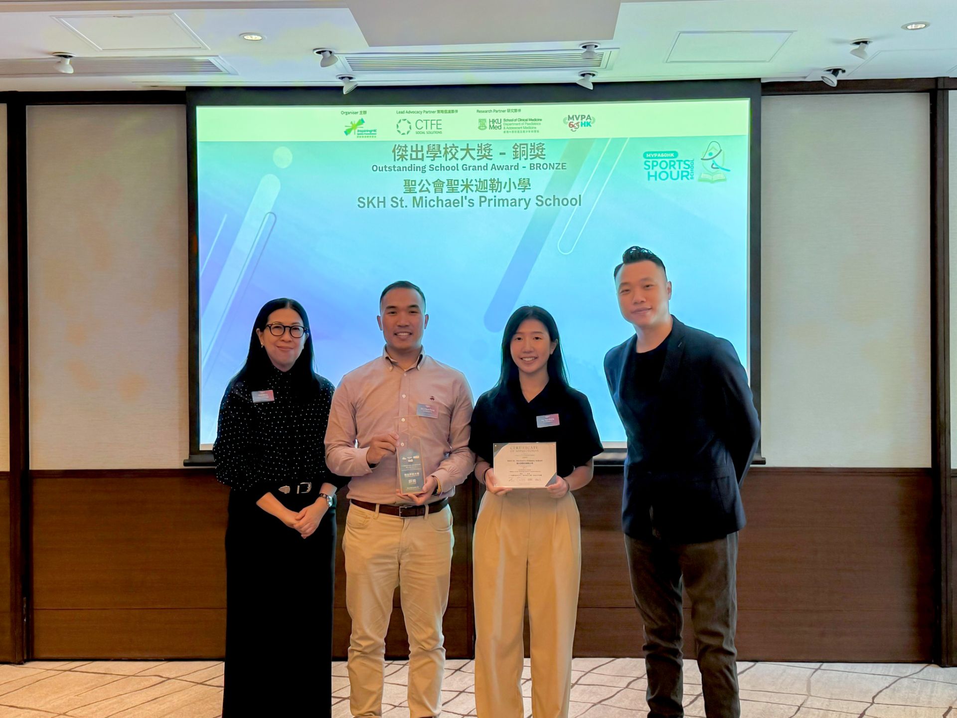 本校參加由【凝動香港體育基金】主辦的MVPA60HK《學校「一」起動嘉許計劃 2024–25》,在47間小學中榮獲「以體育造就青年」傑出學校大獎銅獎,肯定師生及家長推動體育的努力。學校在校政、教育活動及資源分配上積極推動學生達成每日至少60分鐘的體育活動目標(MVPA60),促使同學養成規律運動習慣。體育不僅強健體魄,更培養毅力、團隊精神及自律,提升學習成效。未來學校將繼續以體育為橋樑,幫助學生發展領導力和自信,培養全面發展的青年。感謝全體師生與家長的支持,這份榮譽屬於大家!