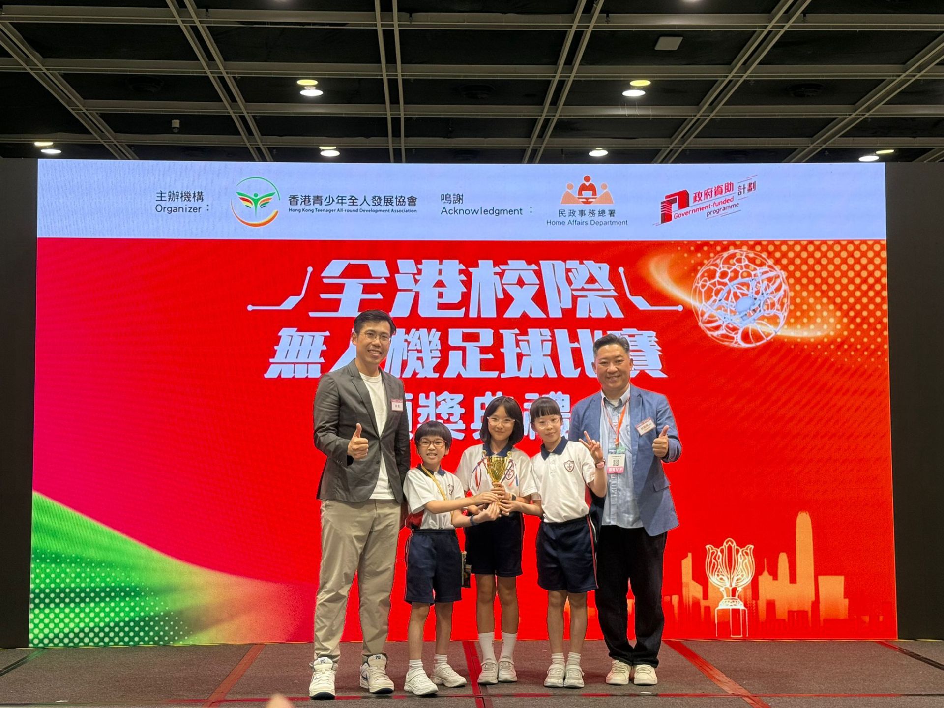 本校無人機足球隊於過去的星期日參加了由香港青少年全人發展協會主辦的<全港校際無人機足球比賽>,隊員在比賽中表現出色,發揮團隊精神,在賽事中獲得: 金盾賽 - 冠軍及金碟賽 - 亞軍,恭喜恭喜!