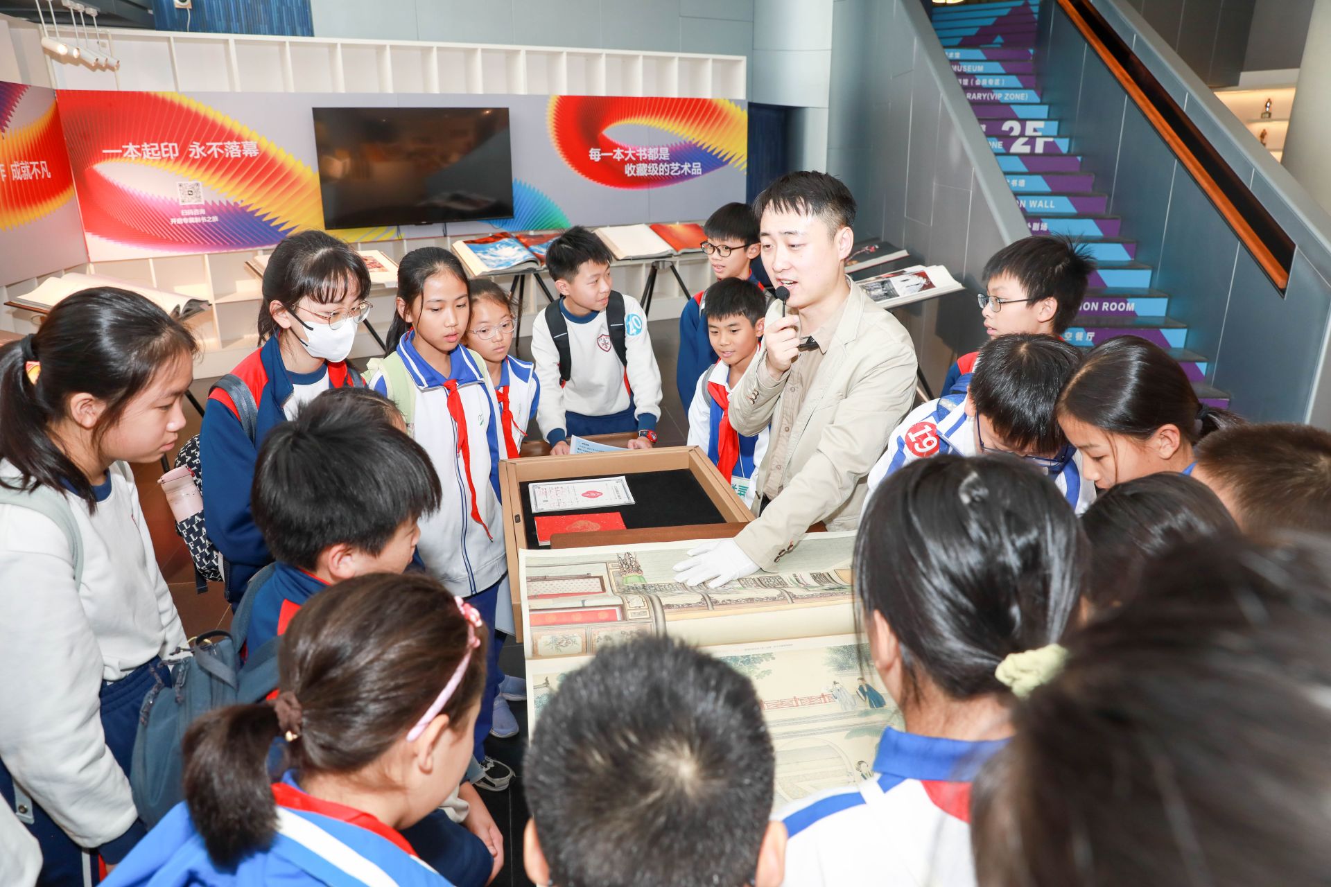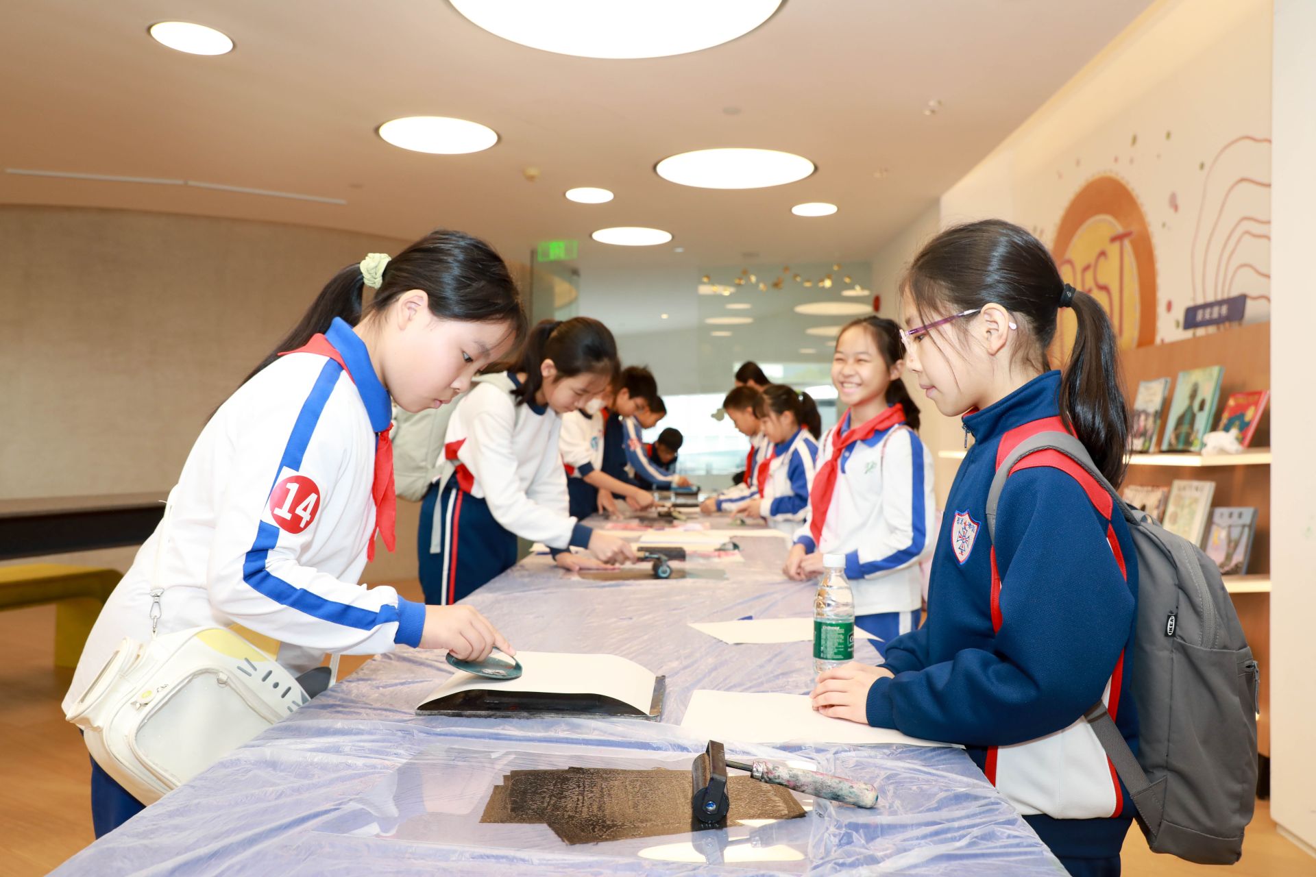 早前鄧校長與老師帶領二十多位熱愛閱讀的同學到訪姊妹學校—深圳南山實驗一小進行閱讀交流。當天我們先到訪「世界頂級藝術書籍誕生地」的深圳雅昌藝術中心。學生分組參與不同的學習活動,如在「文化自信」主題展廳,同學們通過《紅樓夢》、清明上河圖等國家級藝術珍品的傳統書籍與數位文獻對比,縱覽一本書從古至今的演變史詩。大家亦化身小小印刷匠,在專業指導下嘗試木刻版畫製作。而在雅藝課堂上,一部《一本書的誕生》短片揭開了現代印刷的神秘面紗。雅昌集團的工藝工程師親臨講解,從結構設計、印刷工藝到裝幀細節,帶領學生們觸摸樣書,全方位解密一本精美書籍從創意到成品的流程。共進午膳後,兩校的孩子圍繞「深港雙城記」 的七大主題,學生們混合編組,開啟了書籍共創工作坊。同學們分成了特色節日組、城市檔案組、古蹟組、環保組、非遺組、節日習俗組、地道美食組。通過破冰遊戲、知識分享到動手製作立體機關書,孩子們不僅完成了精美的主題書籍,更在合作中建立了真摯的友誼。
