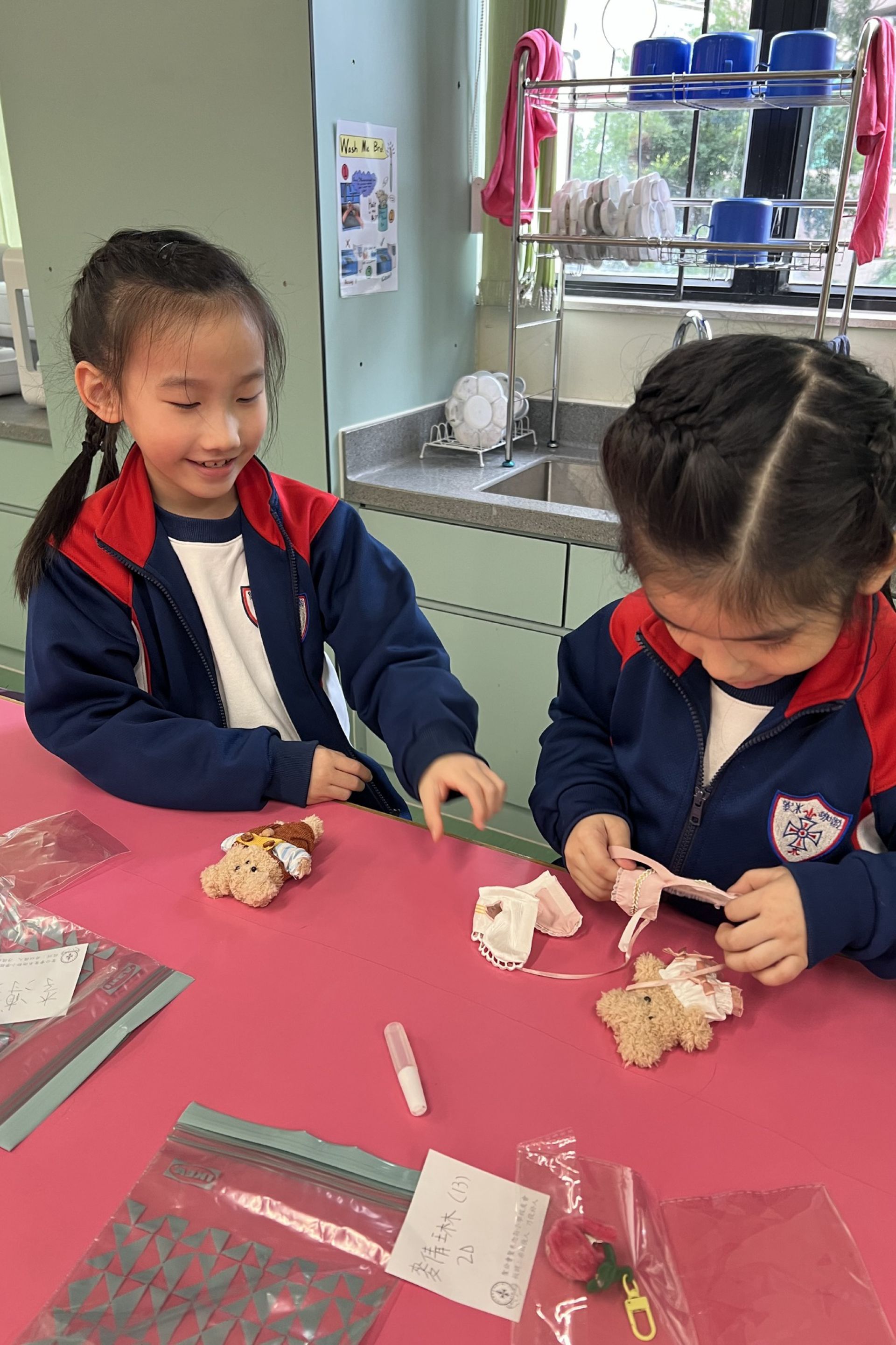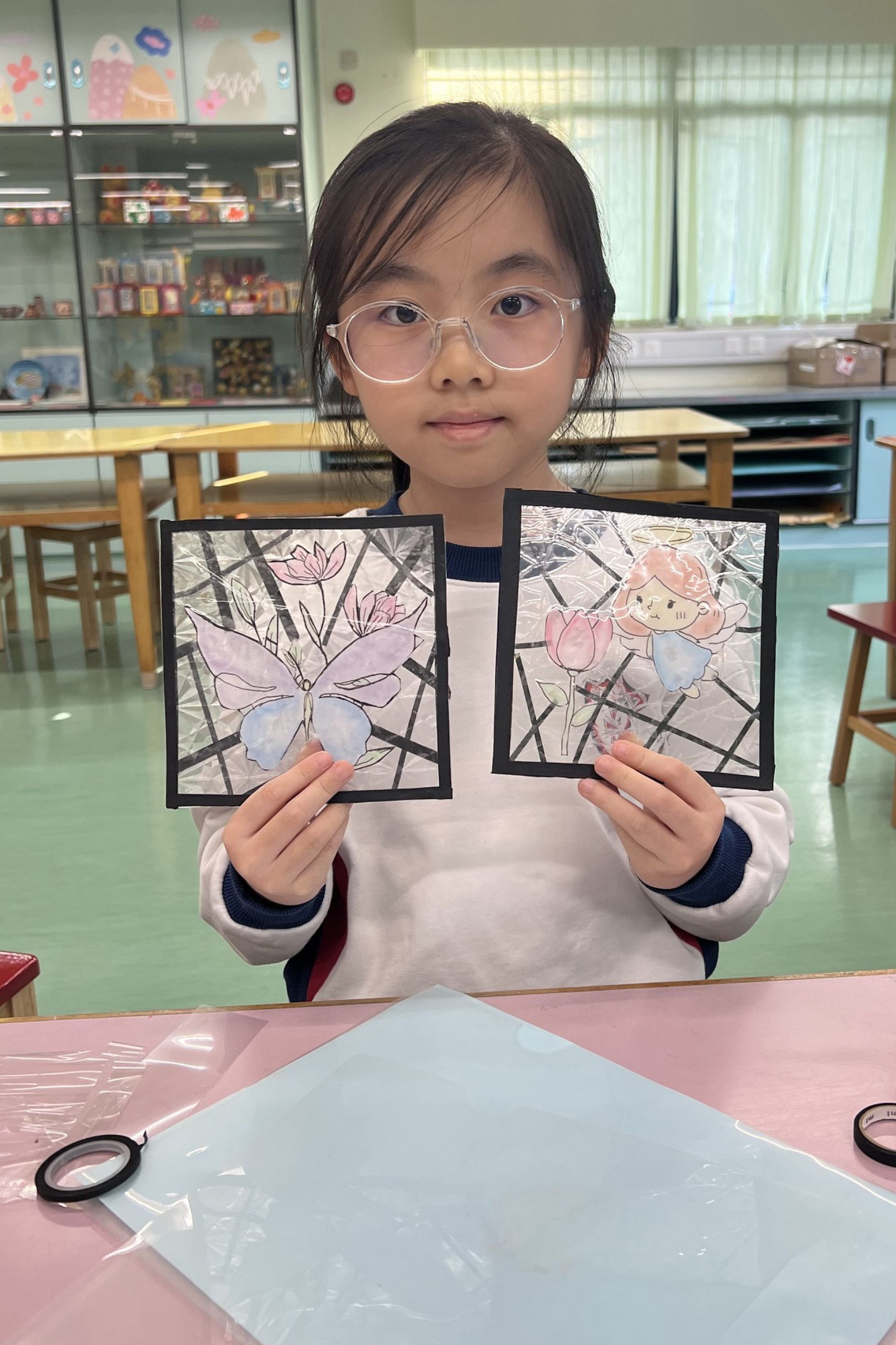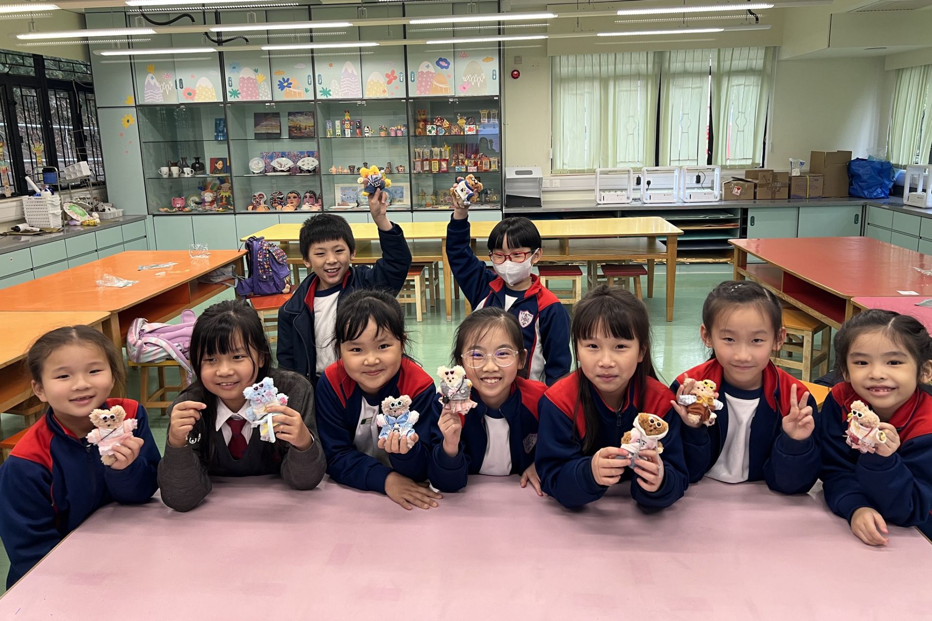 在小二和小三的綜合藝術手工班課程中,同學們發揮創意,製作了色彩斑斕的「聖花藝術玻璃彩繪」。此外,他們還親手製作了可愛的毛根玩偶,並為小熊穿上各式精緻的服飾和配件。我們一起來欣賞同學們的作品吧!